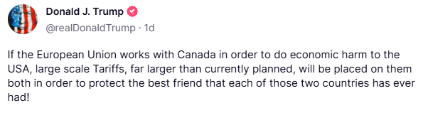 欧洲股市受到全球关税讨论的打击。尽管中国PMI数据改善,矿业部门依然疲软。油价上涨,因为特朗普威胁购买俄罗斯原油的买家。
