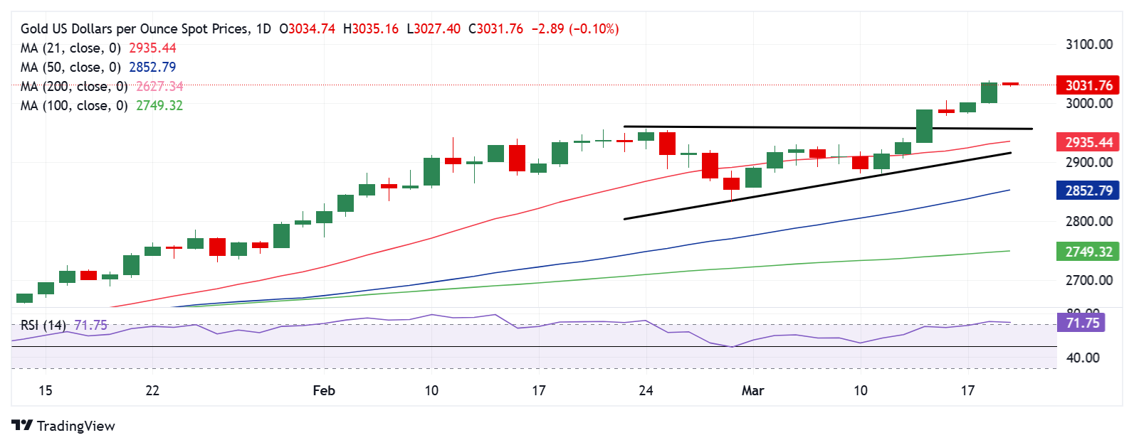 黄金价格在美联储会议当天巩固在历史高点$3,038以下。美元试图反弹,交易者开始调整仓位。黄金价格可能会在恢复创纪录的上涨之前先有所回调。