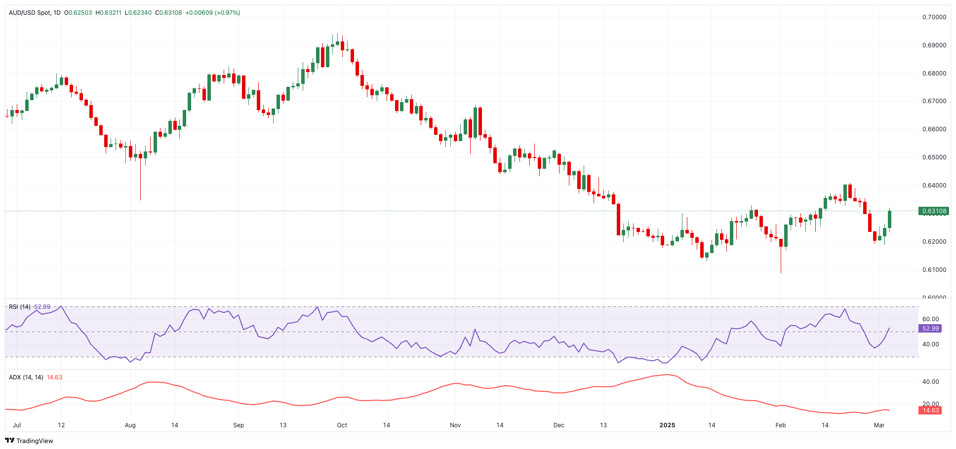 AUD/USD进一步上涨,重新夺回0.6300及以上水平。尽管存在关税担忧,美国美元的卖盘压力依然加大。澳大利亚第四季度GDP数据表现强劲,支持了AUD的表现。