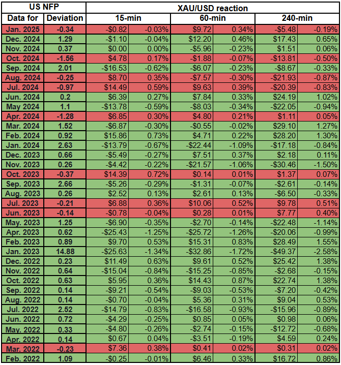 预计美国的非农就业人数在2月份将增加160,000。黄金对令人失望的就业报告的反应可能会比对令人振奋的报告反应更强烈。之前的数据分析显示,黄金价格与非农就业数据意外的负相关关系在发...
