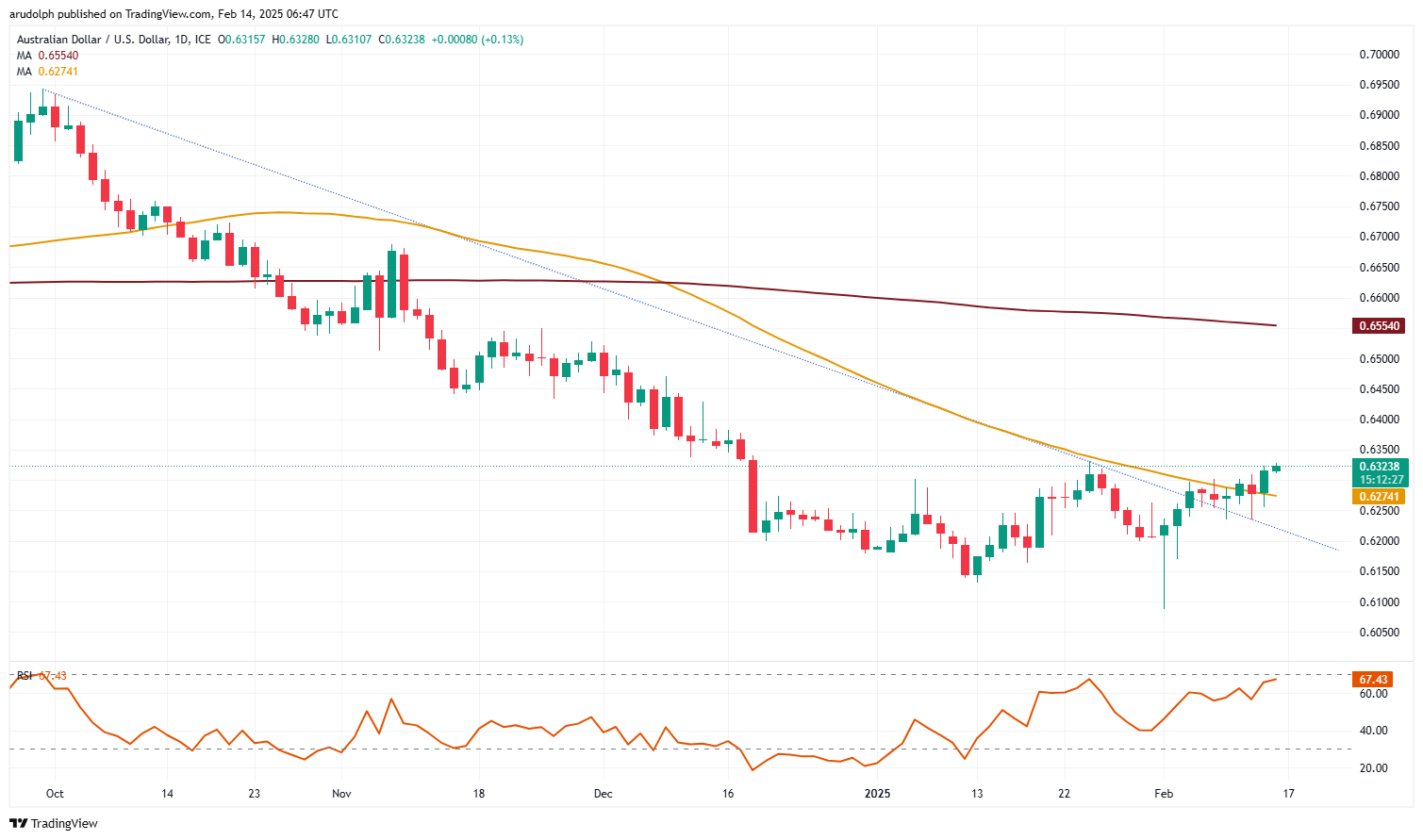 AUD/USD正面临一月底的高点$0.6330,如果在日线和周线图上收盘超过这个水平,将确认中期触底形态,并瞄准$0.6850区域。