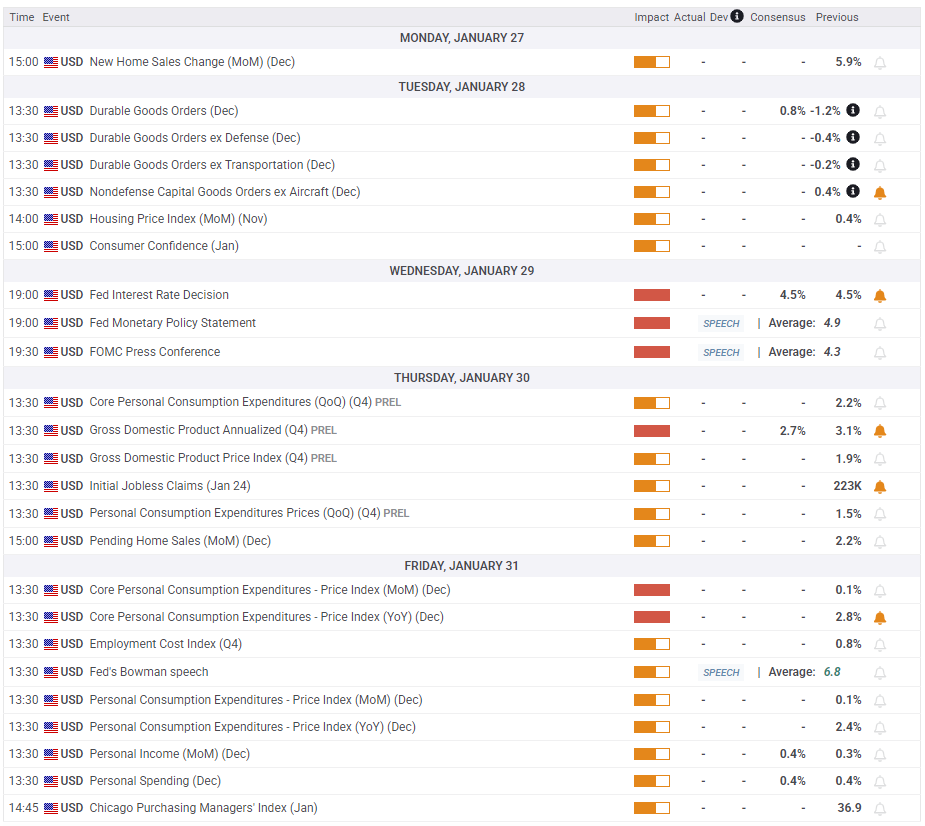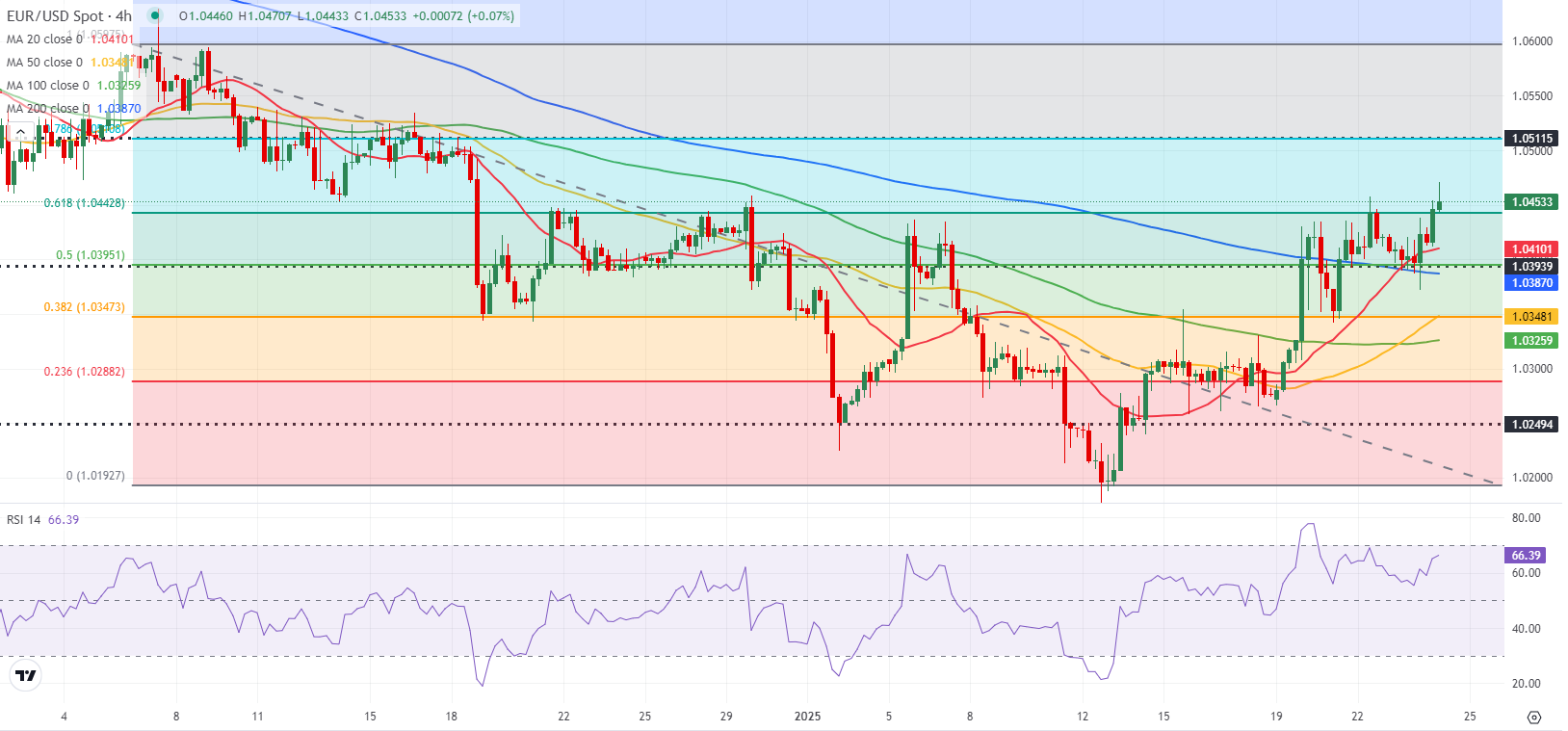 上周五,欧元/美元汇率攀升至1.0450以上的多周高点。市场正在等待1月初的制造业和服务业采购经理人指数(PMI)预测报告。当前技术面展望显示买家兴趣在加强。