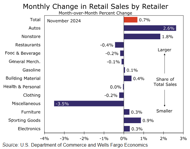 11月份零售额的大幅增长在很大程度上归功于最大的支出类别。汽车销售增长了2.6%。其次大的类别,电子商务,也取得了稳固的增长,达到1.8%。其他任何类别都没有超过1%的增长,因此我...