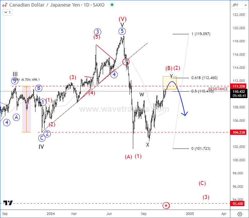CADJPY 今年一直在强劲上涨,但我们从2023年的波低看到五波上涨的走势,现在这个走势已经完成,因为价格急剧跌破了趋势线支撑位。我们看到一个向下脉冲波动,代表着 (A)/(1)...