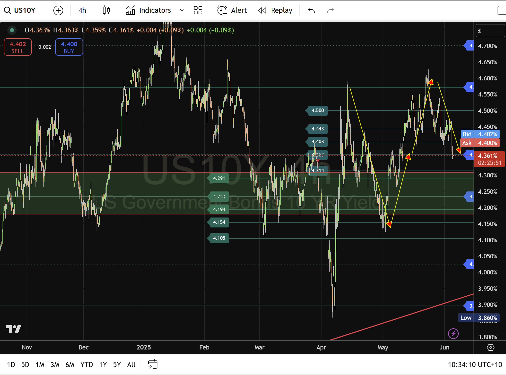 随着4.36%现在成为5月4.15%–4.57%区间的支点,收益率下滑再次确认了市场对美联储鸽派政策的押注,削弱了美元/日元的表现——如果跌破142.39/142.11,则打开14...