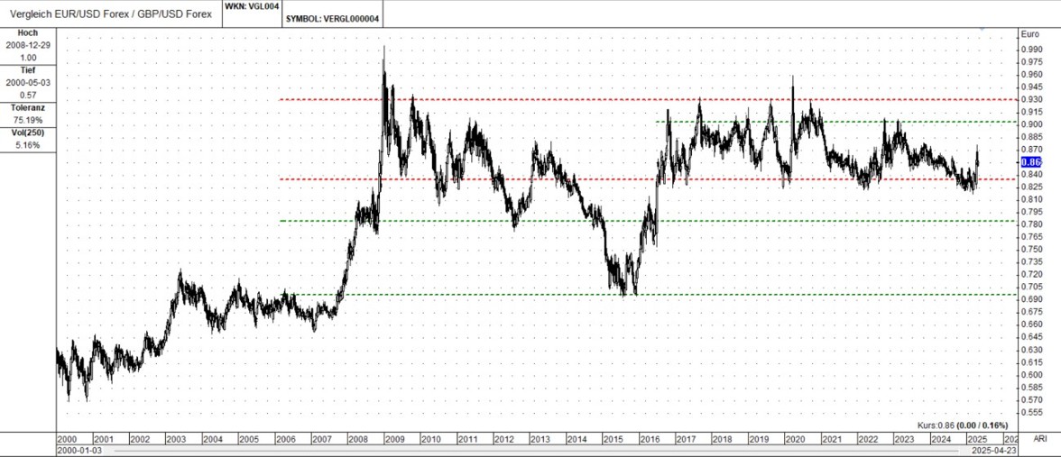 分析师提供的图表关注的是欧元和英镑之间的关系,既包括直接的(EUR/GBP),也包括间接的(EUR/USD相对于GBP/USD的相对强度)。